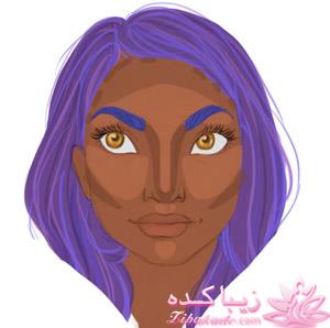 • مرحله هفتم کرم کانتورینگ یا رنگ تیره تر را روی دو طرف خط بینی، زیر گونه ها و کنار خط موها روی پیشانی، جایی که ریشه موهاست، بزنید. (تیره ترین قسمت ها در تصویر)