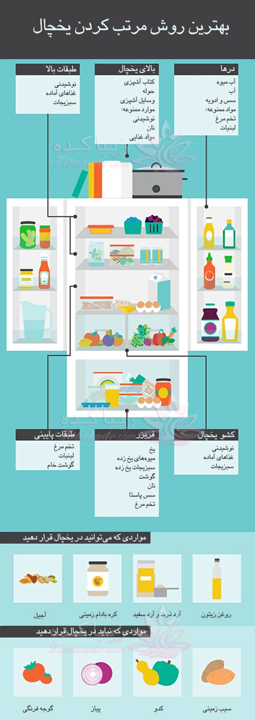 مواد غذایی برای اینکه از رشد باکتری ها و میکروب هایی که باعث بیماری انسان می شود ، در یخچال قرار می گیرند.دمای یخچال باید 40 درجه فارنهایت یا کمتر و فریزر صفر درجه فارنهایت تنظیم شود.با این حال دمای همه قسمت های یخچال به صورت یکسان نیست و باید بدانیم که هر ماده غذایی را در کدام قسمت یخچال قرار دهیم تا بهتر باقی بماند.