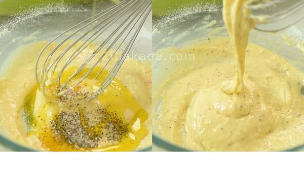 آرد ، تخم مرغ و آب در یک کاسه متوسط با هم ترکیب کنید . وقتی خمیر یکدست شد ، روغن زیتون ، نمک و فلفل را اضافه کرده و خوب هم بزنید .