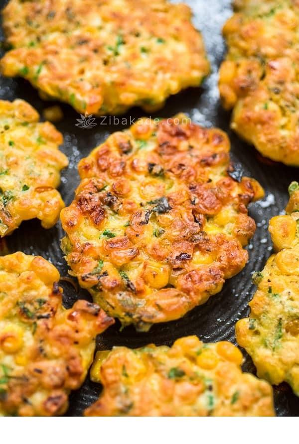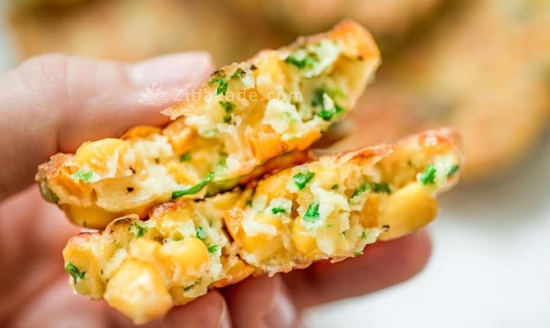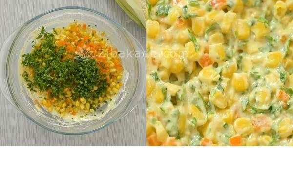 به خمیر بیکینگ پودر، ذرت ، فلفل دلمه ای ، جعفری و پیازچه اضافه کنید. آن را خوب مخلوط کرده و کنار بگذارید.