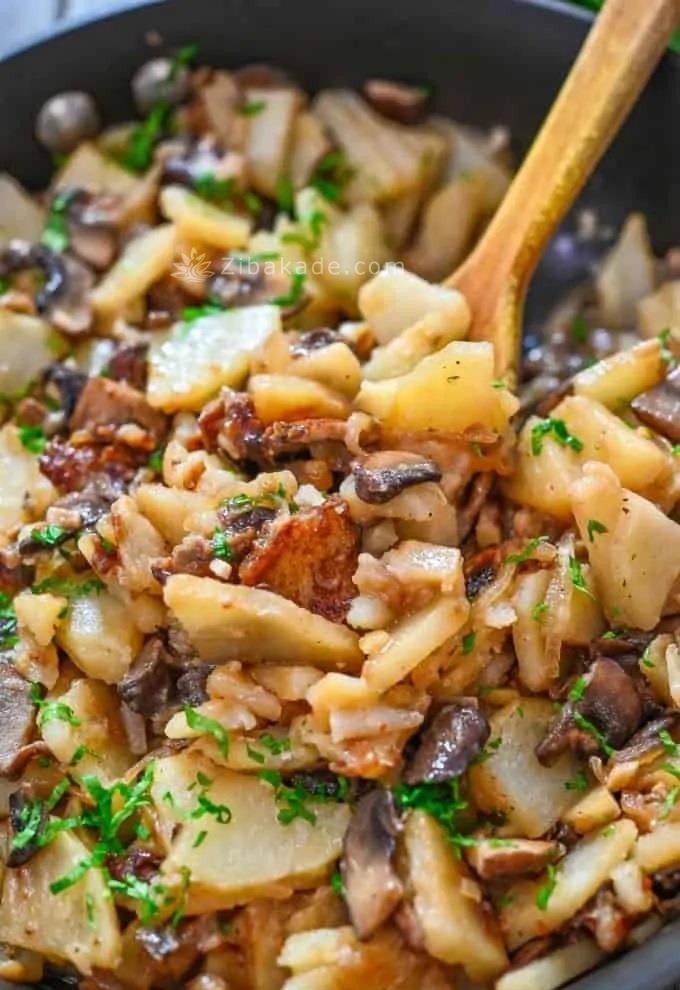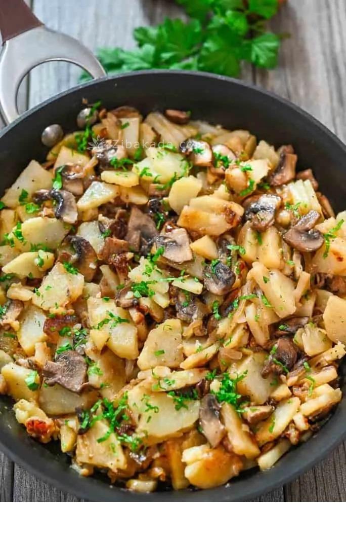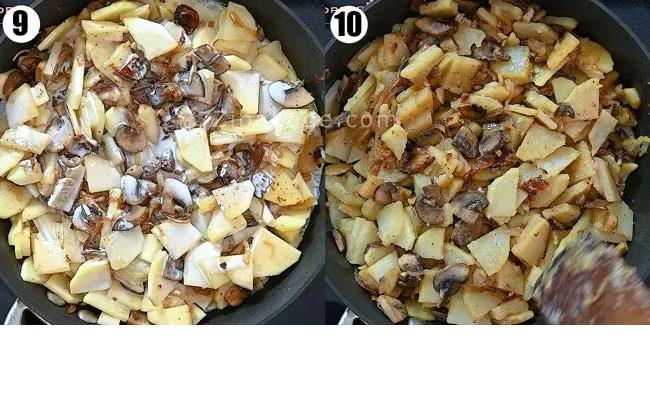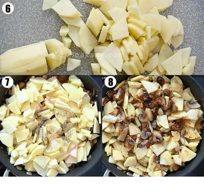 سیب زمینی ، نمک و فلفل را به قارچ ها اضافه کرده و به مدت 10 دقیقه آن ها را سرخ کنید و گاه هم بزنید.