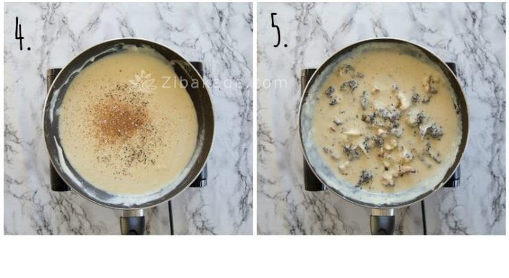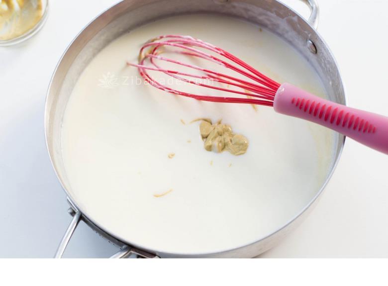 شیر را به آرامی اضافه کنید و بگذارید حدود 5 دقیقه بپزد تا مخلوط آن کمی غلیظ شود.