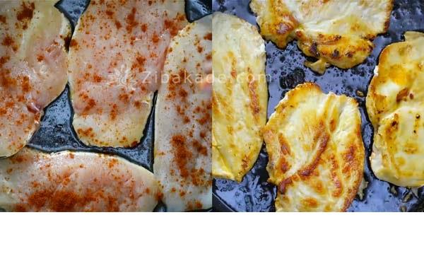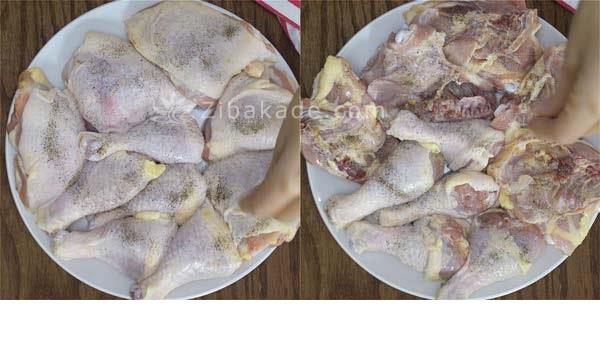 مرغ ها را داخل تابه بچینید و آنها را با نمک و پاپریکا مزه دار کنید.