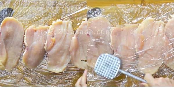 سینه ها را داخل مشما قرار داده و با بیفتک کوب کمی روی آنها را بکوبید تا جایی که از ضخامت یکنواختی برخوردار شوند.