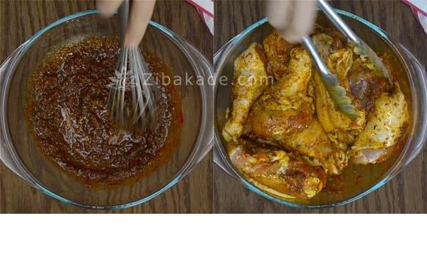 بال و کتف ها را داخل مواد بغلتانید سپس آنها را روی سینی فر بچینید .