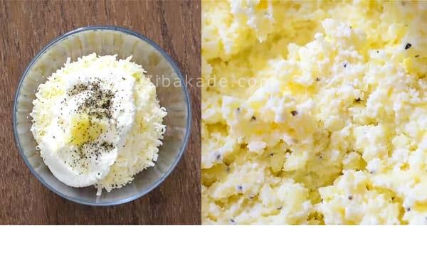 به مخلوط ، تخم مرغ ، روغن و پنیر را اضافه کنید ، دوباره هم بزنید تا مخلوط شوند. کمی نمک به مخلوط اضافه کنید.