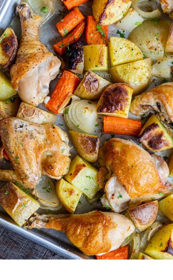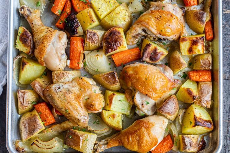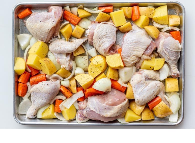 سبزیجات و مرغ را داخل ظرف پخت پخش بریزید.