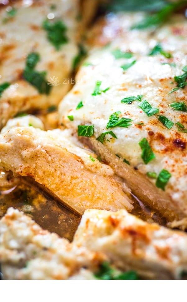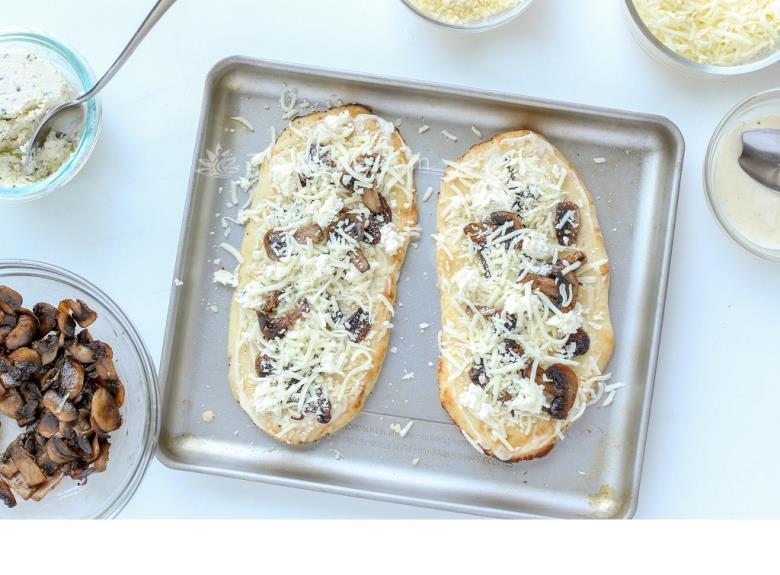 مخلوط پنیر را به چهار قسمت مساوی تقسیم کرده و روی مرغ را به طور مساوی با مخلوط پنیر بپوشانید .