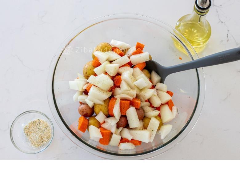 هویج ، سیب زمینی و پیاز را اضافه کنید و روغن آن را بپاشید.