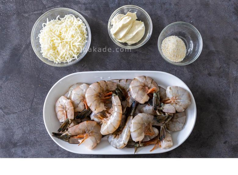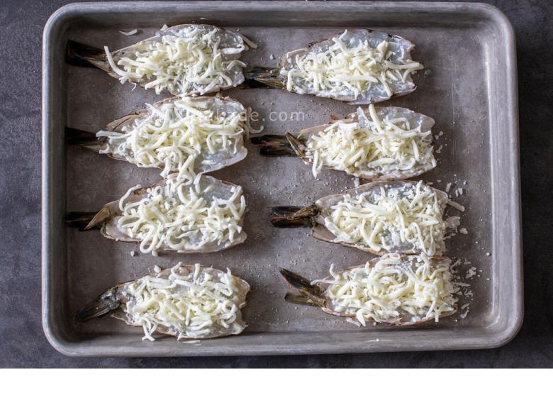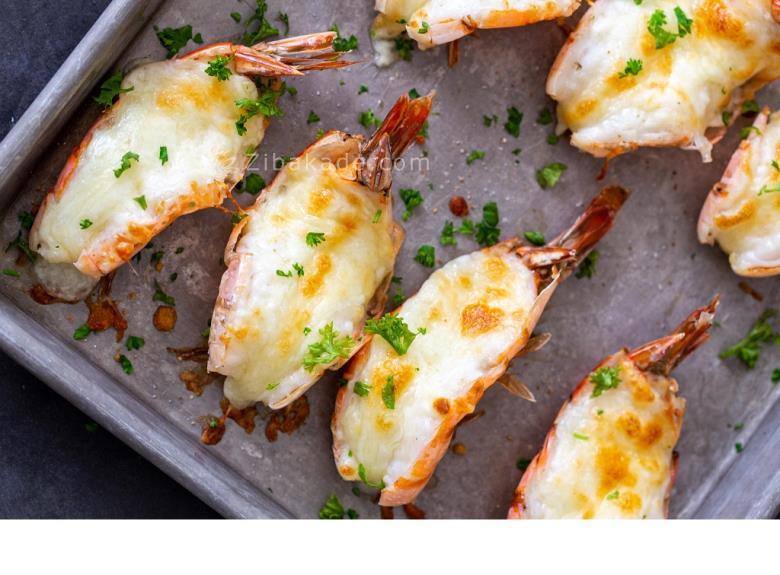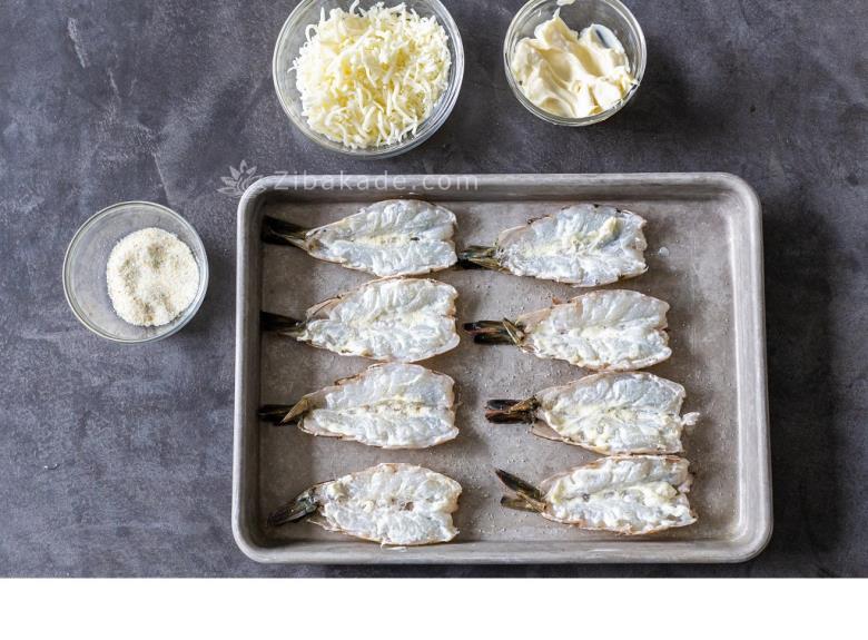 یک لایه نازک سس مایونز را در داخل میگوها بمالید، نمک ، پودر سیر و در نهایت پنیر را روی میگوها بپاشید .