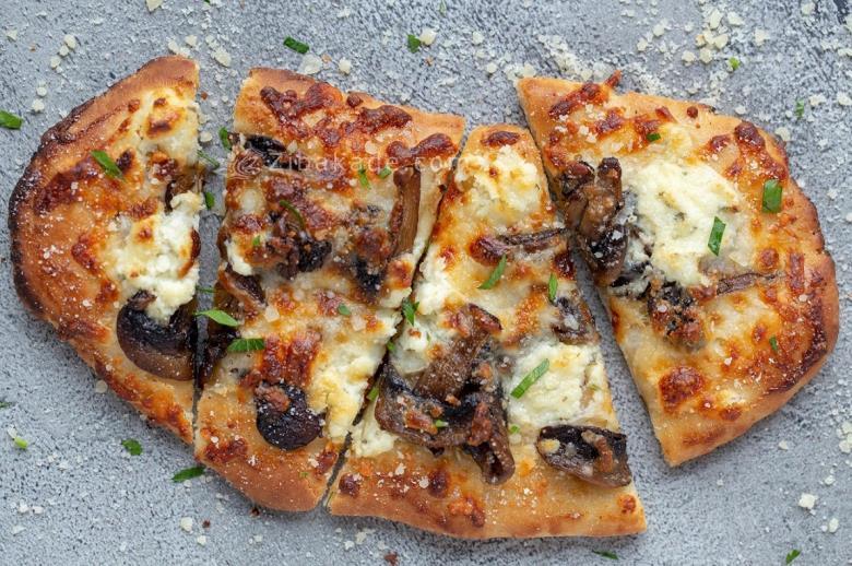 روی خمیر پیتزا را با کمی سس بپوشانید سپس قارچ و بعد از آن هر سه مدل پنیر را روی نان بریزید.