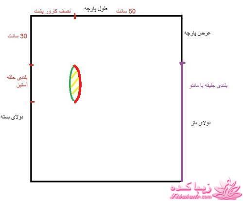 از علامت دومی به اندازه ی بلندیِ حلقه آستینت بیا پایین و اون بیضی رو بکش . در واقع دورِ اون بیضی باید برابر با دورِ کامل حلقه آستین شما باشه .