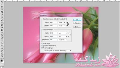 با گرفتن دکمه (Alt+ Ctrl+ I) صفحه ای به نام Image Size باز میشود که با تغییر دادن گزینه Width (که برای سایت زیباکده 400 است) مشاهده میکنیم حجم عکس کم میشود.