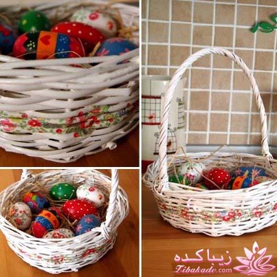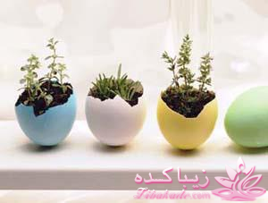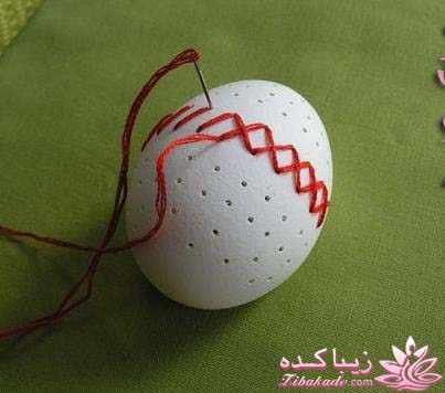 دو طرف تخم مرغ را با سوزن و با احتیاط سوراخ کرده تا بتوانید تخم مرغها را خالی کنید سپس روی آنها را به هر شکلی که می خواهید نقاشی کرده و با استفاده از نخهای رنگی یا روبانهای رنگی که از آنها رد می کنید به درختچه های زینتی کوچکی که می توانید بر سر سفره هفت سین عید نوروز قرار دهید آویزان کنید.