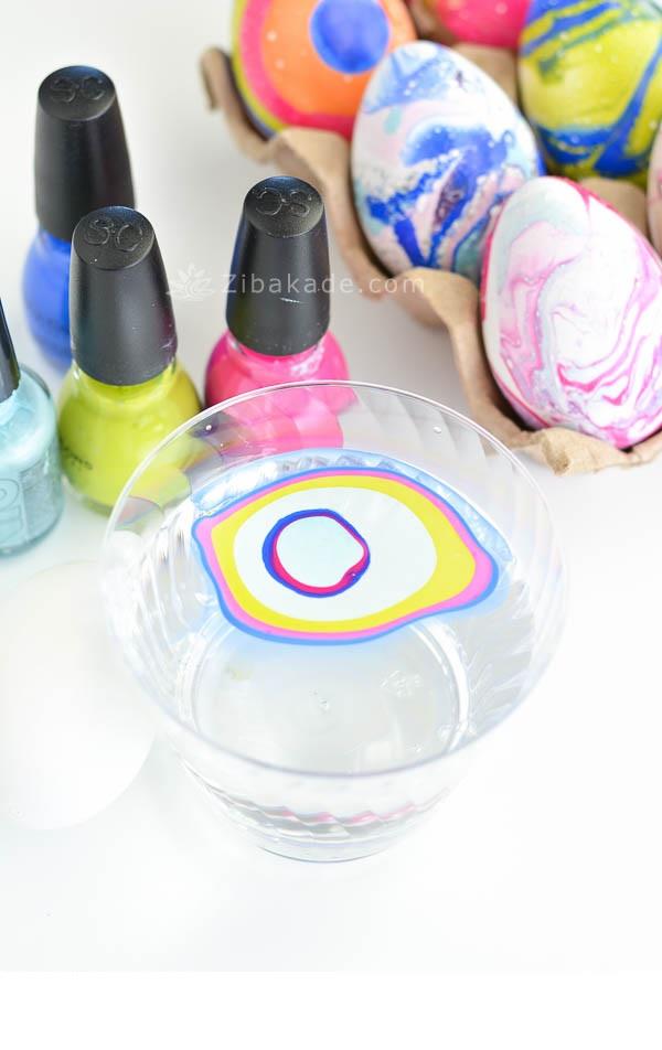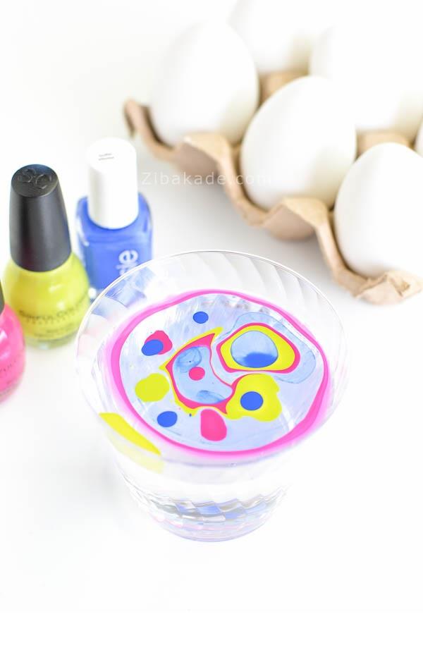 چند قطره لاک با رنگهای مختلف روی آب بچکانید و کمی آن را هم بزنید .