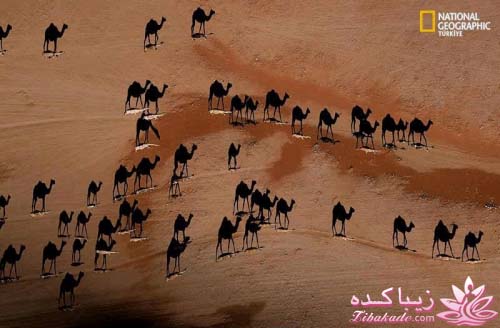 شترهای سیاه احتمالا سایه هستن و اون خطای سفید ریز شترای واقعی هستن . سایه صبح ها کوتاهتره پس احتمالا این عکس ظهر یا بعد از ظهر گرفته شده.....