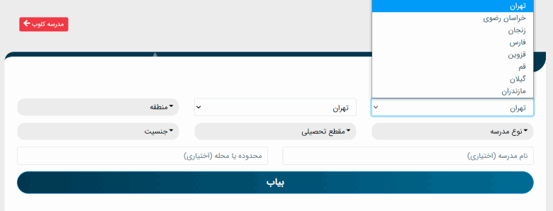 اینم لینک جستجوی مدرسه یاب برای بعضی از مراکز استان. البته بعد از ورود خودتون میتونید هر شهری رو که میخواید انتخاب کنید و مدرسه مورد نظرتون رو توی مدرسه یاب پیدا کنید.