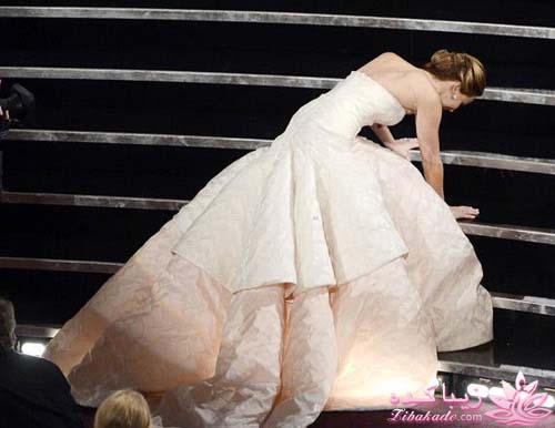 گویا بدشانسی های جنیفر لارنس پایانی ندارد ، جنیفر این بار هم در هنگام دریافت جایزه با مشکل روبرو شد ، وی که در مراسم قبلی لباسش دچار مشکل شده بود این بار هنگام بالارفتن از پله ها برای دریافت جایزه خود به روی زمین افتاد…