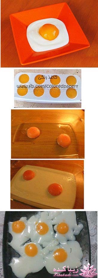 طرز تهیه : نصف بسته ژله پرتقال رو در نصف لیوان آب جوش حل کنین .. بعد نصف لیوان بستنی وانیلی رو که در دمای محیط آب شده بهش اضافه کنین .. حالا از یه جایخی گرد استفاده کنین .. اگه نداشتین میتونین از جا تخم مرغی استفاده کنین یا یه چیز مشابه و بگذارید تو یخچال تا ژله ببنده .. حالا یه بسته ژله آلوئورا رو در یه لیوان آب جوش حل کنین .. بعد یک لیوان بستنی وانیلی آب شده در دمای محیط رو بهش اضافه کنین (میتونین به جای یک لیوان بستنی نصف لیوان بستنی و نصف لیوان شیر اضافه کنین ) .. حالا برید سراغ زرده ها ببینین ژله پرتقال بسته یا نه .. اگه سفت شده یکی یکی از قالب در بیارین و تو یه ظرف که از قبل کمی چرب کردین با کمی فاصله بچینین و ژله آلوئورا رو دور زرده ها بریزین و بگذارین تو یخچال تا کاملا ژله ببنده .. بعد از بستن ژله دورش رو به طور نامنظم با چاقو برش میزنیم و با کفگیر اونها رو داخل ظرف مورد نظر بچینین .. میتونین برای طبیعی تر شدن چند برگ نعنا کنار بشقاب بذارین و مهموناتون رو سوپرایز کنین