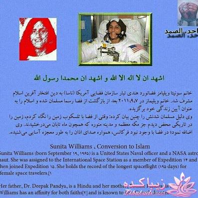 خانم سونیتا ویلیامز فضانورد هندی تبار سازمان فضایی آمریکا (ناسا) به دین افتخار آفرین اسلام مشرف شد. خانم ویلیماز در ۲۰۱۱٫۹٫۷ بعد از بازگشت از فضا رسما مسلمان شده و اسلام را به عنوان آیین زندگی خود برگزیده.