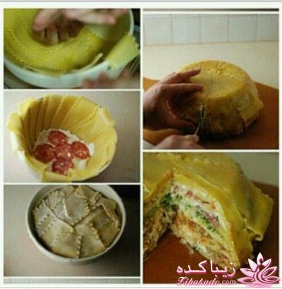 لازانیا رو داخل ظرف گرد که میتونه پیرکس یا ظرف کیک باشه مطابق شکل میچینید، کف ظرف و دور تا دور آن را میچینید حتی روی هم روی هم بعد یک لایه مواد میریزید و از لایه های بیرونی به داخل برمیگردونید و همینطور لایه لایه تا بالا ادامه میدید...