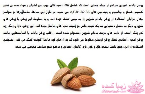 روغن بادام شیرین سرشار از مواد مغذي است كه شامل 78% اسيد هاي چرب غير اشباع و مواد معدني نظير كلسيم ،فسفر و پتاسيم و ويتامين هاي A,E,B1,B2,B6 مي شود. در طول این سالها، ماساژورها در سراسر جهان مزایای استفاده از روغن بادام شیرین را به خوبی کشف کرده اند، و یا مخلوط این روغن با روغن های ضروری دیگر به دنبال دستیابی به یک نتیجه خاص در زمینه مدیا های ماساژ بوده اند. این روغن، دارای رنگ زرد کم رنگ است، از دانه های درخت بادام شیرین استخراج شده است . اغلب روغن بادام با اسانسهایی مانند روغن لیمو ، اسانس نعنا، روغن آویشن مخلوط می شود که به آرامش فرد ماساژ گیرنده کمک می کند . همچنین استفاده از این روغن باعث بهبود خلق و خوی فرد، کاهش استرس و ترویج بهتر سلامت عمومی می شود