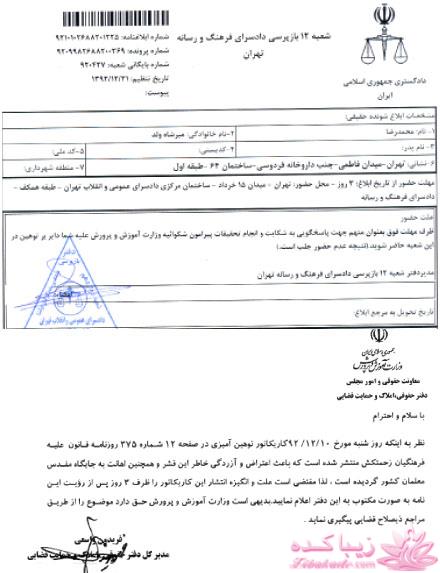که حاکی از شکایت وزارت آموزش و پرورش بابت یکی از کاریکاتورهای این