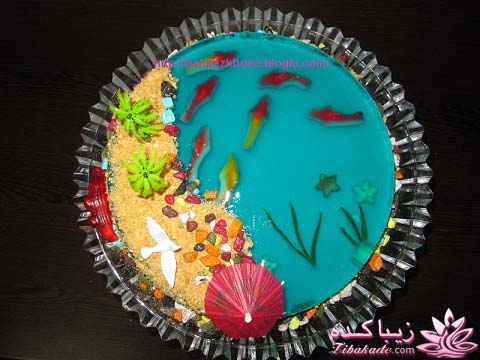 گذاشتم ژله ام توی همون ظرف غلیظ بشه ..مثل سفیده تخم مرغ ..بعد پاستیل های کوسه رو در جهات مختلف واردژله کردم