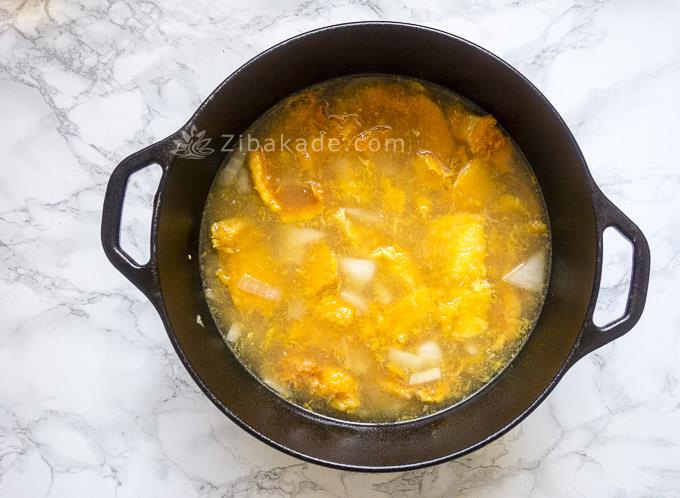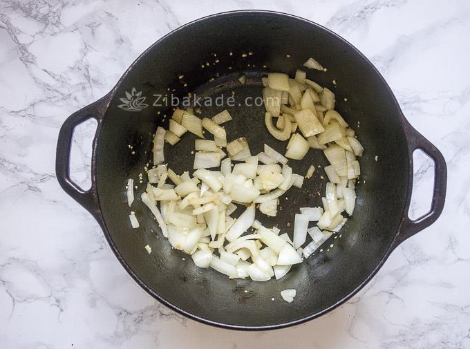 ۴. بهتر است پیاز را خلالی و نازک خرد کنید و در روغن تفت دهید تا طلایی شود و کمی زردچوبه نیز به آن اضافه کنید تا خوشرنگتر شود.