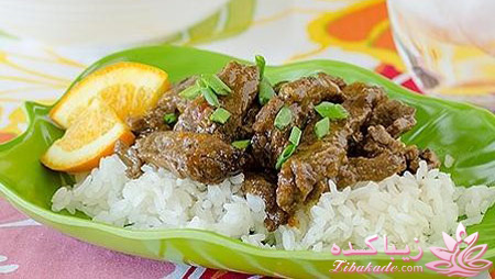 پوست پرتقال (رنده شده) پوست یک پرتقالآب پرتقال1/2 فنجان شکر قهوه ای 50 گرم سرکه برنج 2 قاشق غذاخوریسس سویا 2 قاشق غذاخوریسس فلفل 2 قاشق چای خوریزنجبیل (رنده شده)2 قاشق چای خوریآرد ذرت 2 قاشق چای خوریروغن کانولابه مقدار لازمگوشت گاو 680 گرم برنج پختهبرای 4 نفرپیازچه (خرد شده برای تزئین)3 تا 4 عدد