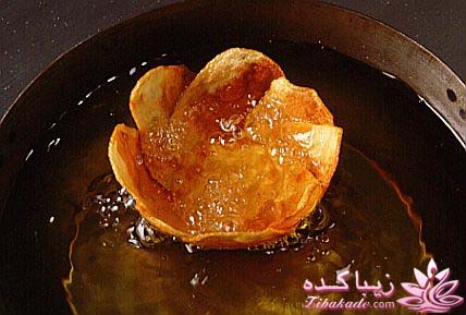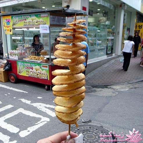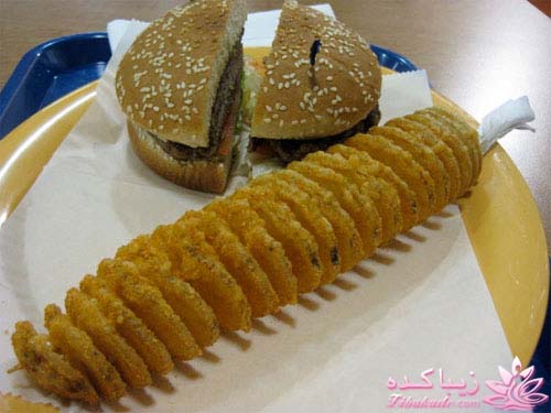 سیب زمینی های یک دست و یک اندازه رو انتخاب کنید و بعد مانند تصاویر زیر سیخ کباب چوبی رو از وسط اون ها رد کنید و با یک چاقوی تیز از بالا به پایین به صورت اسپیرال برش بزنید و بعد در سرخ کن یا روغن شناور سرخ کرده و با چاشنی های مختلف سرو کنید.