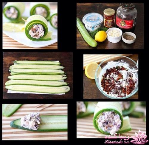 رول خیار و فتا؛ پیش غذای اشتها آور درست کردن رول های خیار و فتا سخت نیست و خیلی سریع و آسان آماده می شود. می توانید آنها را به عنوان اشتهاآور، پیش غذا و ... سرو کنید. مواد لازم: خیار بزرگ يك عدد شوید دو شاخه گوجه فرنگی خشک شده دو قاشق غذاخوری زیتون هشت عدد ماست چهار قاشق غذاخوری پنیر فتا سي گرم آب لیموی تازه. يك قاشق چایخوری فلفل سیاه کمی دستور تهیه: با رنده مخصوص یا چاقو، خیار را از طول به برش های بلند و نازک ببرید. برش ها را روی حوله یا دستمالی بگذارید تا آب آنها گرفته شود. شوید را ریز ریز کنید و گوجه فرنگی خشک شده و زیتون ها را نیز به همین ترتیب خرد کنید. ماست، پنیر فتا و آب لیمو را در کاسه ای مخلوط کنید. بعد گوجه فرنگی خشک، زیتون و شوید خرد شده را به مخلوط فوق اضافه کنید و به آن فلفل سیاه بزنید. برش های خیار را روی تخته برش آشپزخانه بگذارید. یک قاشق چایخوری از مخلوط فتا را در انتهای یک برش بگذارید. برش خیار را رول کنید و با خلال دندان محکم کنید. و بگذارید سرد شود تا آماده سرو کردن شود. این رول ها اشتهاآورهای جالبی برای سفره های مهمانی هستند. حتماً آنها را امتحان کنید