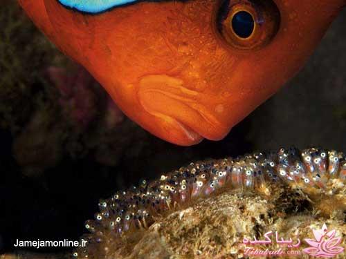 یک دلقک ماهی نر به دقت مواظب بچه ماهیهایش است که از تخم سر بیرون آوردهاند.
