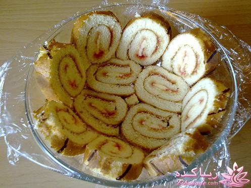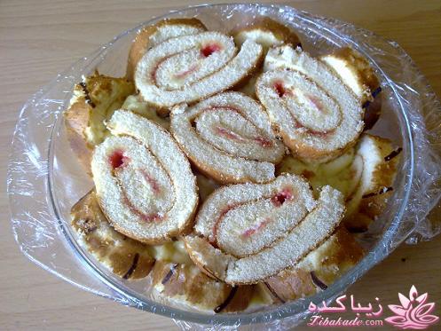 میذاریم کرم یه کمی سرد و غلیظ بشه تا وقتی روی رولتها میریزیم خمیرشون نکنه ..ظرف رو تا حدی پر میکنیم که جا برای یا لایه رولت روی ظرف باشه ..روی ظرف رو با رولت می پوشونیم و میذاریم ببنده