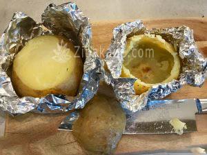 سر سیب زمینی های تنوری شده را برش میزنیم و توی آنها را با یک قاشق با دقت خالی میکنیم. برای اینکه دستتان نسوزد حتما با دستمال سیب زمینی ها  را نگه دارید و برای اینکه دیواره آن ها خراب نشود از قاشق مرباخوری در آغاز کار استفاده کنید و هنگام خالی کردن سعی کنید به دیواره ها فشار وارد نکنید.