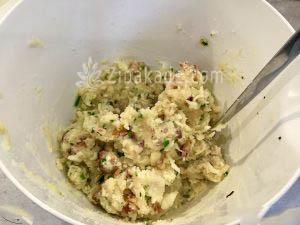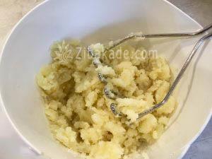 سیب زمینی های را خارج شده را با گوشت کوب خوب له میکنیم. تره خرد شده، پنیر پیتزا را به همراه نمک و فلفل اضافه کرده و خوب مخلوط میکنیم. در آخر تخم مرغ را با بقیه مواد مخلوط میکنیم.