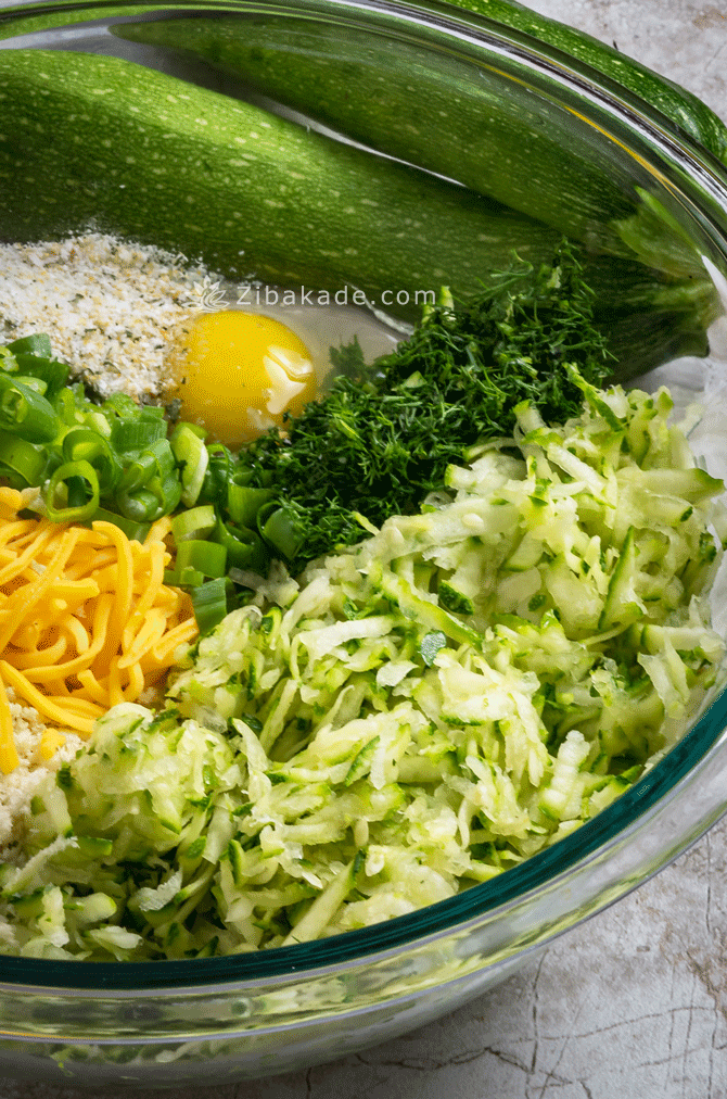 در یک کاسه بزرگ ، کدو سبز ، خرده نان های پانکو ، پنیر چدار ، تخم مرغ ، پیاز سبز ، شوید و چاشنی ها را با هم بزنید تا خوب ترکیب شوند.