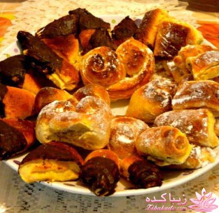 خمیر را به قطر 4-3 میلی متر پهن کرده، به اندازه 30×15 می بریم و در وسط خمیر یک نقطه مرکز قرار داده و روی آن شکر و دارچین می پاشیم. بعد خمیر را از دو طرف به نقطه مرکز لوله کرده و خمیر را به صورت ورقه های 5/1 سانتی متری می بریم و در سینی چرب شده می چینیم. سپس در فر داغ با درجه حرارت 400 فارنهایت مدت 12-10 دقیقه می گذاریم تا شیرینی ها طلایی شوند.