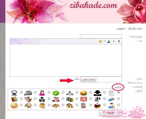 در قسمت ایجاد تاپیک جدید در عکس اول قسمتی که می توانید عکس خود را از سیستم خود انتخاب کنید را نشان می دهد و در صورتی که بخواهید عکس های بیشتری قرار دهید روی کلمه بیشتر که با دایره در عکس نشان داده است کلیک می کنید.