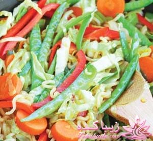 هربار كمي از روغن را داغ كرده و به نوبت زنجبيل، سير، جوانه ماش، هويج، كدو، قارچ، پيازچه، فلفل و بروكلي را در آن سرخ كنيد مرغ را هم كه حداقل نيم ساعت قبل در سويا سس خوابانده شده در روغن سرخ كنيد اما سويا سس را دور نريزيد سبزيجات را به تابه برگردانده و آب مرغ را روي آن ريخته و به جوش آوريد سويا سس را اضافه كرده و با شعله كم و در بسته 4 دقيقه مواد را بپزيد نشاسته را در چند قاشق غذاخوري آب سرد حل كرده و به غذا اضافه كنيد نمك و فلفل غذا را اندازه كرده و با نودل يا چلو سرو كنيد.