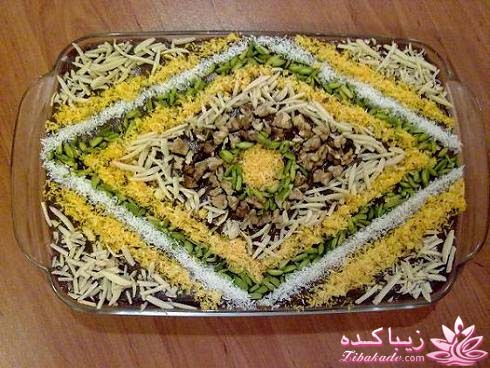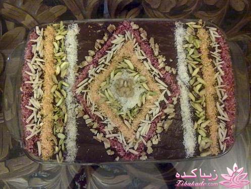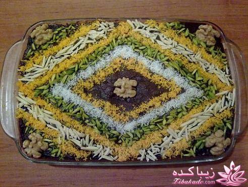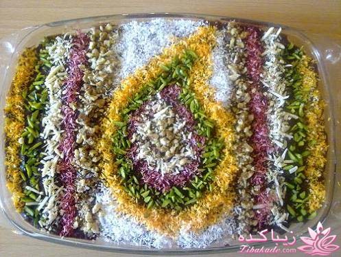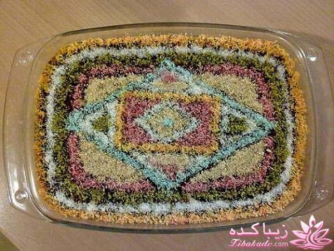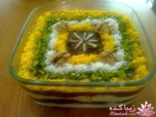 اینکه روی دسر با پودر پسته و پودر نارگیل رنگین تزیین بشه تو دستور اصلی نیست و من اینطوری درست میکنم ..