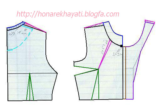 یعنی از نوک سینه دوسانت پایین میریم و برای ساسون کنار سینه 2سانت به عقب میریم و خط جدید رو چرخ میکنیم