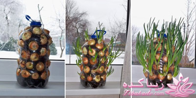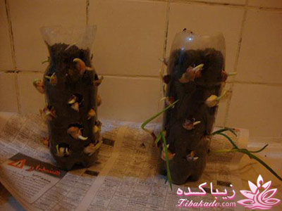 بطری نوشابه یا دوغ رو بردارید و توش دایره دایره سوراخ کنید و کم کم خاک بریزید و بعدش هم سیرهارو دونه دونه توش فرو کنید(میتونید از سبزی هایی مثل: نعناع ک ساقه داره هم استفاده کنید).