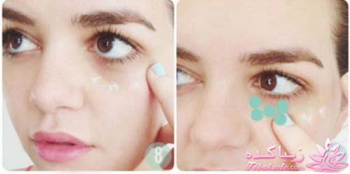 به مقدار نیم سانت از کرم دور چشم را به روی انگشت اشاره خود می گذارید.سپس از گوشه چشم مثل شکل زیر شروع به ضربه های آرام به زیر چشم می زنید.مواظب باشید خیلی نزدیک مژه های پایین نباشد تا داخل چشم نرود. و این کار را تا انتهای چشم ادامه می دهید.