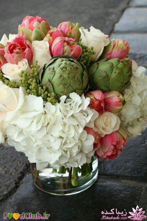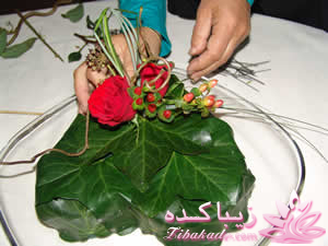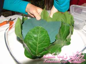 گل ها را درون آب گرم قرار می دهیم چون باعث میشه دوام گل بالا برود بعد اسفنج را 15 دقیقه درون آب قرار می دهیم تا آب را به خوبی جذب کنه بعد وقتی آب خوب جذب اسفنج شد آن را خارج کرده و با سیم محکم در سبد مورد نظر ثابت می کنیم و شروع می کنیم برگ های پهن به دور اسفنج قرار می دهیم می توانید برگ ها را با کمک سیم محکم کنید و بعد روی اسفنج را خوب با برگ پرکنید گل ها و شاخه ها را با کمک سیم محکم کنید و داخل اسفنج بزنید