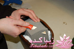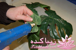 برای شروع کار اول اسفنج در آب گرم قرار می دهیم وقتی خوب آب جذب شد درون گلدان سفالی قرار می دهیم و بعد اضافه های اسفنج را میبریم و برای اینکه اسفنج محکم در گلدان قرار بگیره از خزه یا سنگهای متوسط استفاده بکنید تا اسفنج حرکت نکنه و برگها را با چسب حرارتی به طور نامنظم روی اسفنج می چسبانیم وقتی اسفنج به طور کامل از برگها پر شد گل های دلخواه خود را با کمک سیم محکم کرده و داخل اسفنج قرار می دهیم و شاخه های تزئیینی می توانید به دلخواه در کنار گل قرار دهید