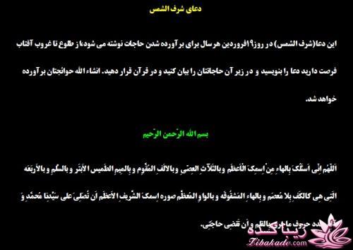 این دعا(شرف الشمس) در روز ۱۹ فروردین هر سال برای برآورده شدن حاجات نوشته می شود، از طلوع تا غروب آفتاب فرصت دارید دعا را بنویسید و در زیر آن حاجاتتان را بیان کنید و در قرآن قرار دهید. انشاء الله حوائجتان برآورده خواهد شد.